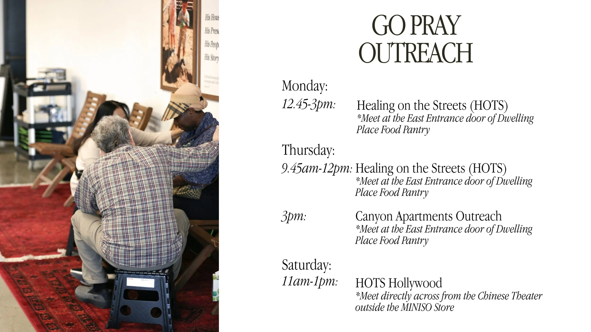 We'd love for you to 'Go Pray' wherever you are - at your local coffee shop, gym, workplace, neighborhood, or school. As a church community, we're also hosting some different outreach opportunities for you to engage in as you go pray.